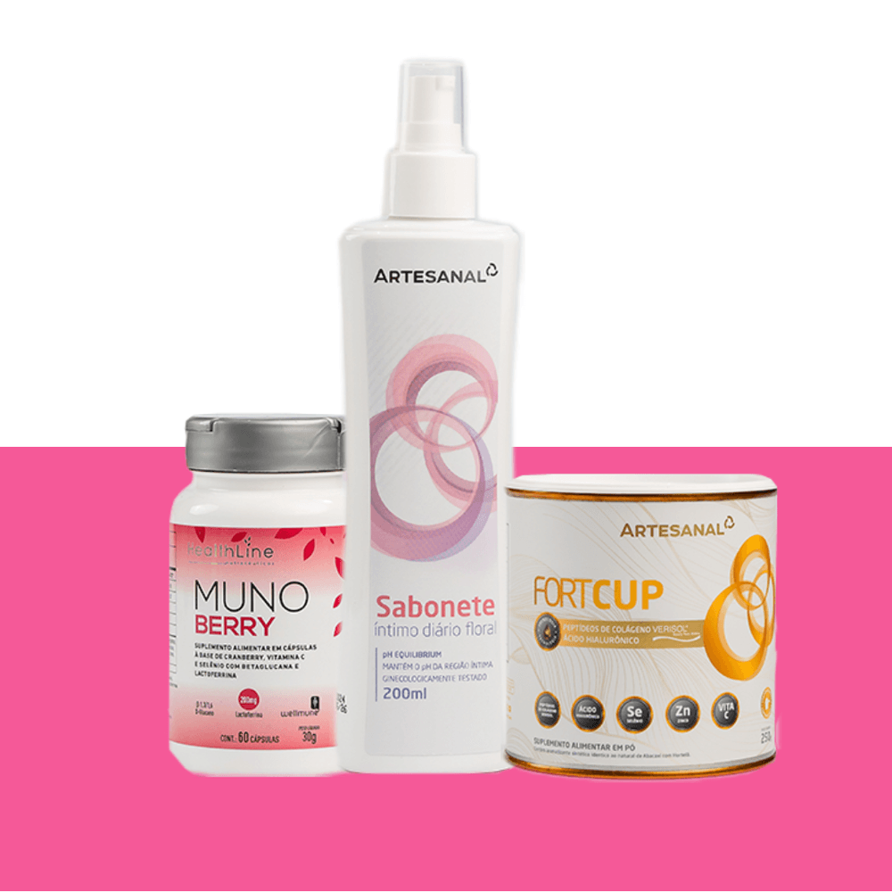 | Mini-descrição | Kit composto por: Munoberry - 60 Cápsulas FortCup Biopeptídeo de Colágeno + Ácido Hialurônico - Abacaxi com Hortelã - 250g Sabonete Íntimo Diário 200ml |